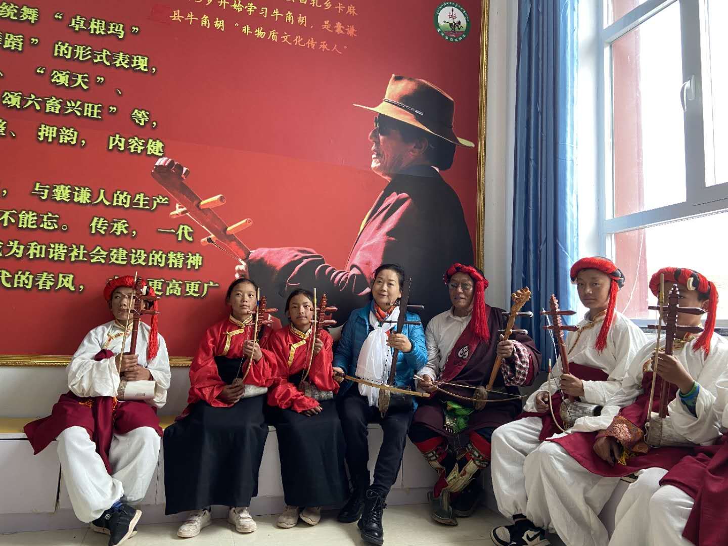囊谦白扎乡是牛角胡的故乡,其表现形式一般以“颂歌”和“舞蹈”相结合。白扎乡小学十多年来,一直聘请囊谦牛角胡非物质文化传承人71岁的久南老师在业余时间培养学生,目前学习牛角胡的学生是25人。