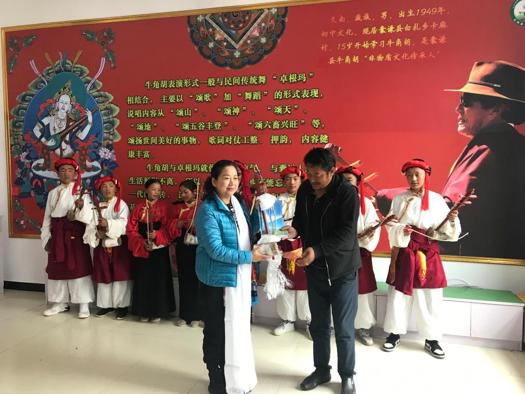 调研中,囊谦白扎乡小学校长尕尼向王金锐捐赠了一把牛角胡和校本教材。囊谦牛角胡的理论研究、曲目的记录与整理、演奏技法的拓展、传承及培养等都为我们提供了很好的研究土壤,希望囊谦县教育局、师大音乐学院、师大附属玉树实验学校、囊谦白扎乡小学能利用牛角胡的传承和研究积极谋划,努力探索出一条非遗传承和艺术人才培养的新路。