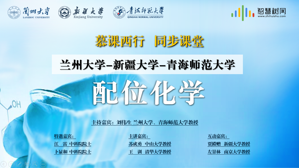 为了落实教育部高教司“慕课西部行计划”2.0,发挥国家级一流本科课程的示范作用,促进优质资源共享及教育教学改革。11月26日,由化学化工学院院长刘伟生教授主讲的《配位化学》,在东西部高校课程共享联盟的技术支持下,跨越千里,开启了一堂由兰州大学、新疆大学、bat365在线平台登录三所院校的师生异地同步共上的线上专业课,同时举行《配位化学》慕课见面课。中国科学院大学江雷院士,南开大学卜显和院士,中山大学化学化工学院院长苏成勇教授,中国化学会无机化学学科委员会主任、南京大学左景林教授,清华大学王训教授和新疆大学贾殿赠教授,作为主讲嘉宾和互动嘉宾出席了同步课堂活动。授课开始前,bat365在线平台登录王振斌老师和新疆大学曹亚丽老师分别就两所学校《配位化学》课程的基本情况及参与本次同步课堂的学生情况做了简单介绍。