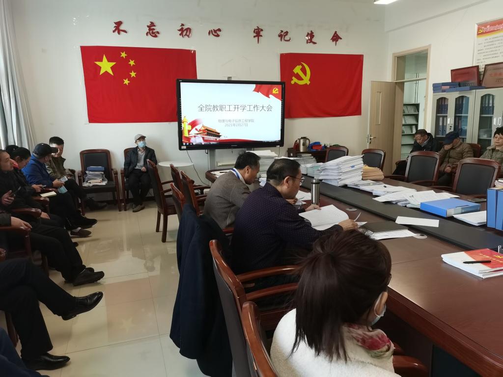 为保障学院各项工作顺利开展,圆满完成2021年上半年度各项工作。2月27日上午,物理与电子信息工程学院召开了全院教职工大会,安排部署新学期各项工作。会议由院党总支副书记王敬佩主持,常务副院长黄湘宁,院长助理王甲泰及学院全体教师参加会议。