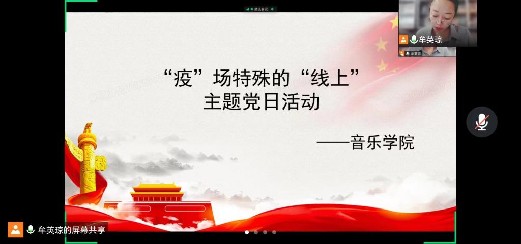 疫情期间,为进一步增强党员凝聚力,深化党史学习教育,坚决打赢疫情防控阻击战,5月18日,音乐学院教工党支部组织围绕以“疫情防控、党员当先锋,筑牢校园疫情防线,守好校园安全底线”为题,开展了“疫”场特殊“线上”的主题党日活动,活动由教工支部书记牟英琼同志主持。