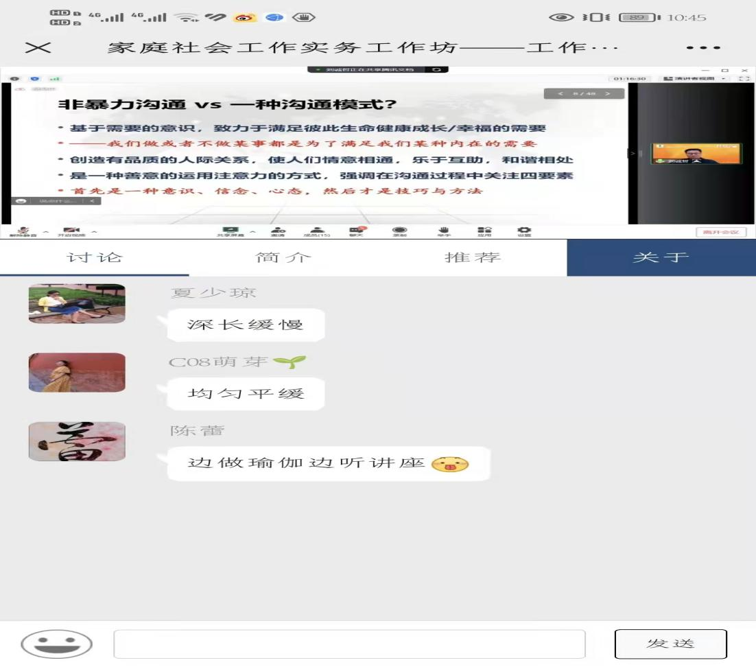本次讲座的主题是“工作生活中的非暴力沟通”。主讲人刘诚哲博士,国家执业二级心理咨询师,中国管理科学研究院学术委员会智库专家,太平洋萨提亚研究院临床会员。讲座采用腾讯会议的形式进行,山东大学、华东师范大学、内蒙古工业大学、bat365在线平台登录等国内高校的社会工作专业师生和社工组织的同仁约3000人聆听了讲座。