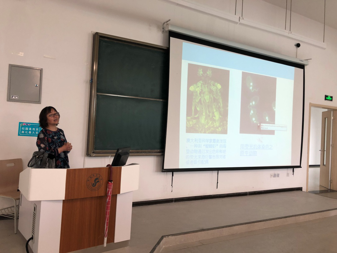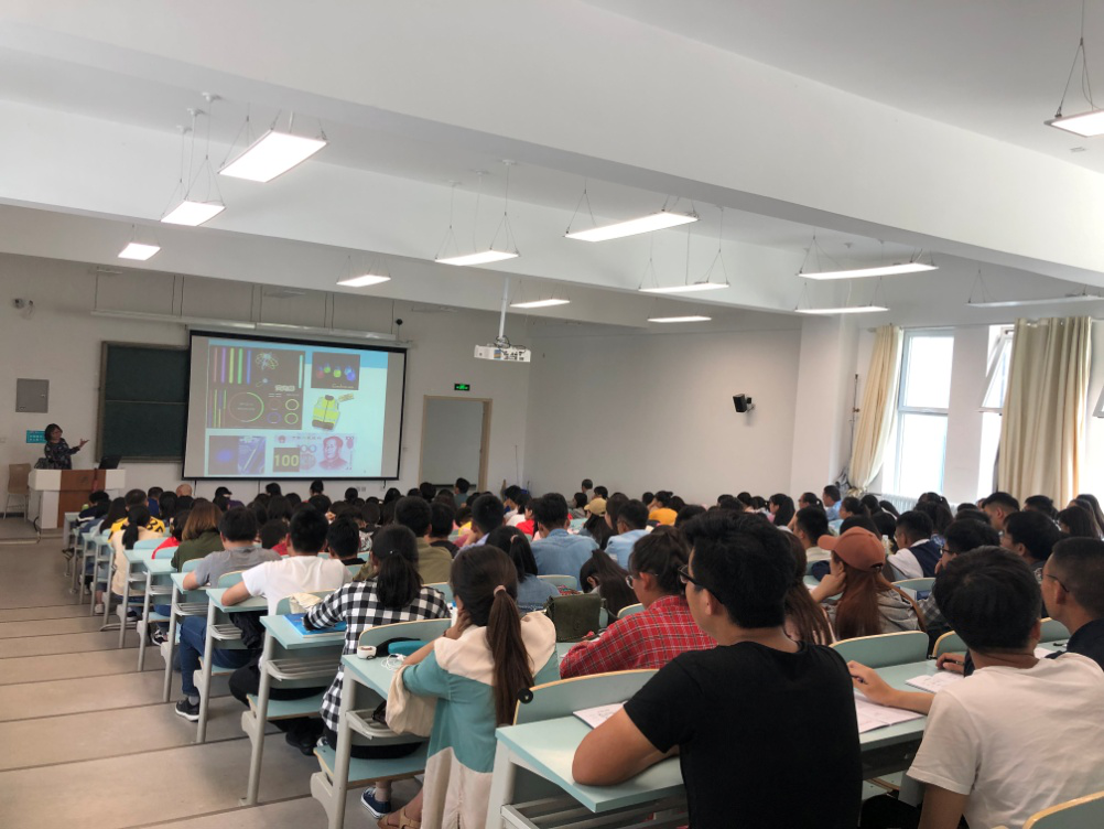 讲座上,韩爱霞教授从当前环境污染状况引入,介绍了荧光分析方法的研究现状及荧光传感器的构建方法,详细讲解了Hg2+、Cd2+、Pb2+、Cu2+四种金属离子荧光传感器的制备和性能研究,并展示了黄河源水样的测定结果,为实现金属离子的快速经济测定提供新方法。