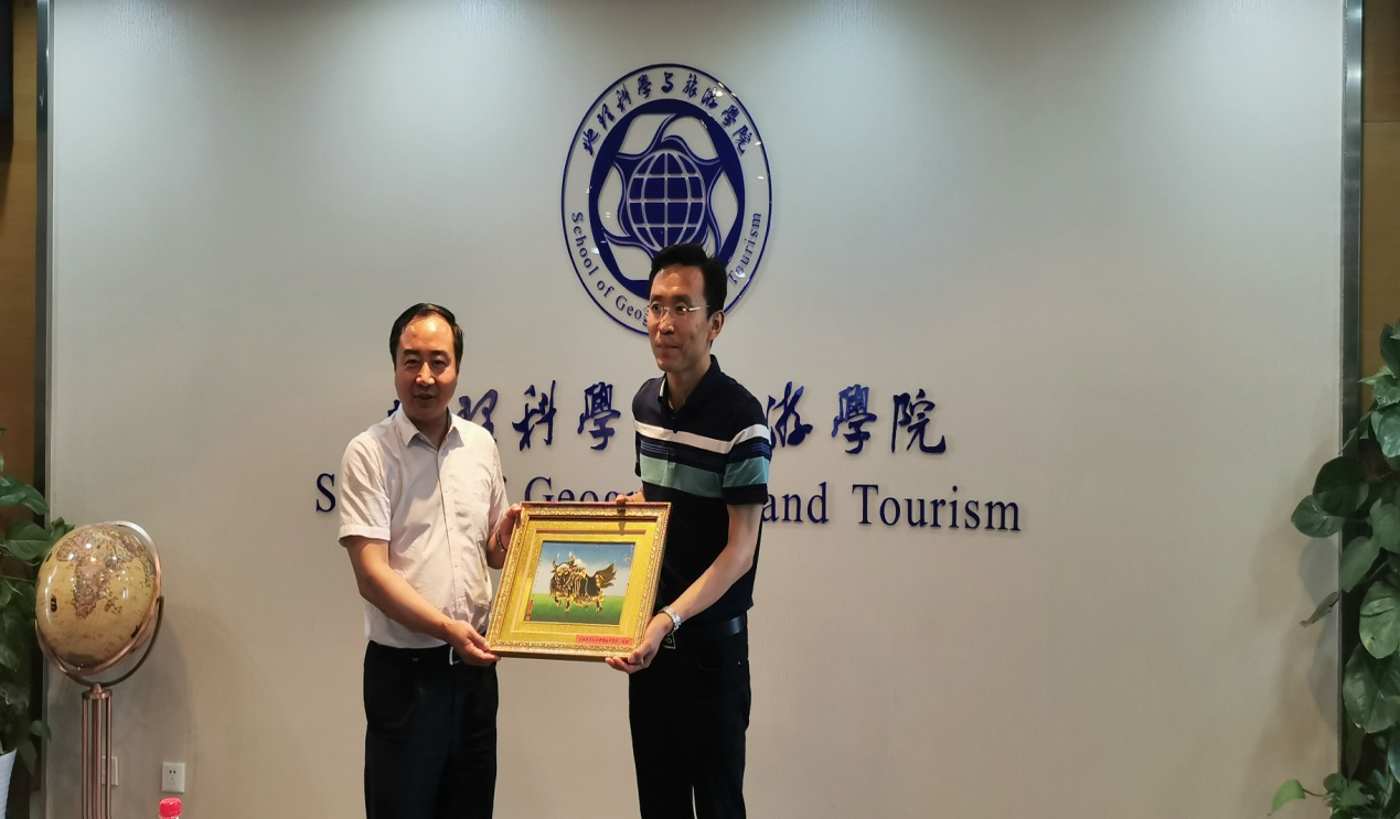 在陕西师范大学长安校区文汇楼,双方就对口支援与合作事宜进行了深入交流。王明道代表陕西师范大学地理科学与旅游学院对学院一行人的来访表示欢迎,认为陕西师范大学地理科学与旅游学院与bat365在线平台登录进理科学学院对口帮扶工作启动早、持续时间长,合作历史源远流长,合作成效丰硕。周正朝院长,李君轶、李晶副院长就学科建设、研究生培养、本科教学等工作做了介绍。杨登兴介绍了365官网“4+N”对口支援工作格局,对陕西师范大学地理科学与旅游学院帮扶bat365在线平台登录地理学科取得的丰硕成就表示衷心感谢。葛岳静就学院发展历程、师生规模、学科建设、科学研究、平台建设、人才培养、社会服务等做了全面的介绍,鄂崇毅重点介绍了高原科学与可持续发展研究院研究领域、专家团队等情况。