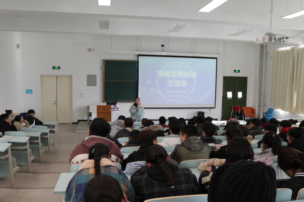 在经验交流会上,首先由参加玉树支教实习的江巴、才仁求珍等同学,就玉树的地理特征、人文习惯和学生的学习情况为大家做了详细介绍。他们说,虽然玉树条件相对艰苦,但是在支教过程中自己独立解决问题、独立完成教学任务,学会与每一个孩子相处,这些都对自身素质提升有极大的帮助。随后,由力本加、张璇等在西宁附近州县支教的同学为大家分享了自己支教的所见所得。他们强调到,农村中小学中大多数孩子都是留守儿童,因此教学过程中要增加情感互动,成为孩子们的知心朋友,支教时间虽然短暂,但是应该带着真实情感和对教师职业的敬畏去教学。通过支教,同学们都有一个共同的感受,就是作为一名师范生,顶岗支教是必须要参加的,而且他们通过支教实习爱上了教师这个职业。