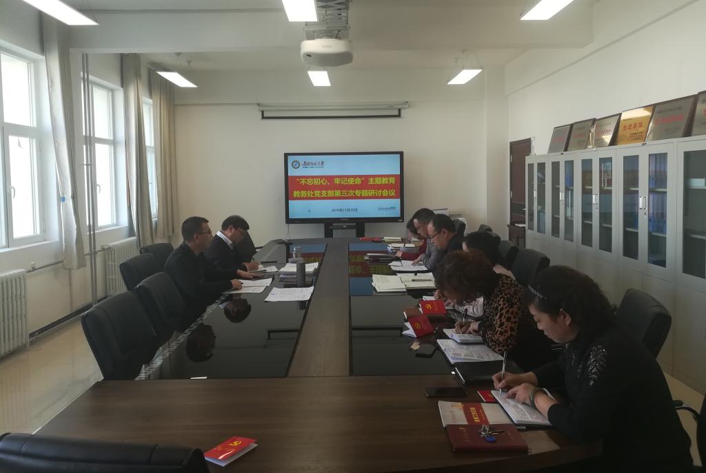 11月22日至25日,根据学校主题教育办公室相关要求,教务处党支部利用2个半天时间开展了“不忘初心,牢记使命”第三次主题研讨会。全体支部党员参加了会议,会议由教务处党支部书记马俊主持。