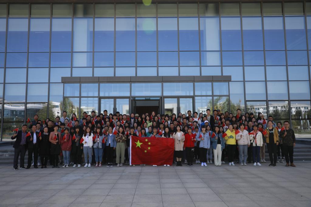 礼炮轰鸣,歌声嘹亮;整齐的队伍,威严的军容;晴朗的天空,欢呼的人群,无不显现出由数十万人参与的新中国成立70周年阅兵庆典的隆重与壮观。当国旗升起,国歌奏响的那一刻,全体师生自发起立,同唱国歌,场面感人。认真聆听习总书记重要讲话,习总书记提到“中国的昨天已经写在人类的史册上,中国的今天正在亿万人民手中创造,中国的明天必将更加美好。全党全军全国各族人民要更加紧密地团结起来,不忘初心,牢记使命,继续把我们的人民共和国巩固好、发展好,继续为实现‘两个一百年’奋斗目标、实现中华民族伟大复兴的中国梦而努力奋斗!”时,现场师生十分激动,不由自主地响起热烈的掌声。随后,阅兵式正式开始,15个徒步方队、12个空中梯队、32个装备方队,威武之师、胜利之师;10万群众、70组彩车、“建国创业”、“改革开放”、“伟大复兴”3个部分,充分展现中国共产党团结带领全国各族人民从站起来、富起来到强起来的伟大征程,深深激发了师生们无限的民族自豪感和爱国热情,自发地挥舞着小国旗随着节拍一起高歌,汇聚成一片红色的海洋。全体师生合唱《我和我的祖国》,激情奋进的歌声在整个报告厅回荡,发自内心的掌声、欢呼声不绝于耳。最后,部处党员干部和广大学生合影留念,为共同祝福祖国70华诞留下珍贵的记忆。