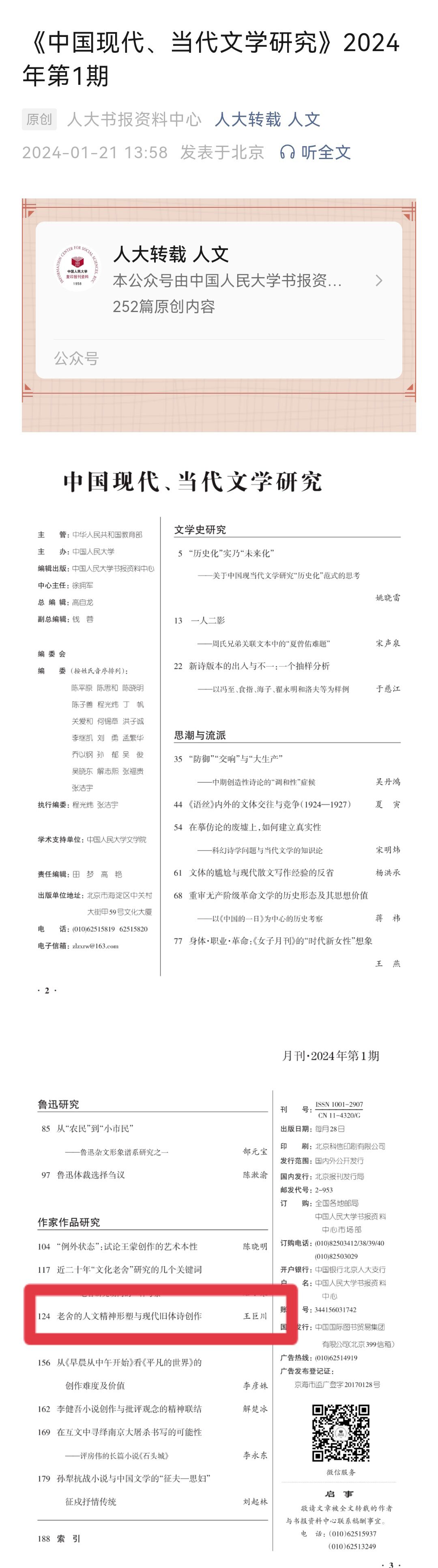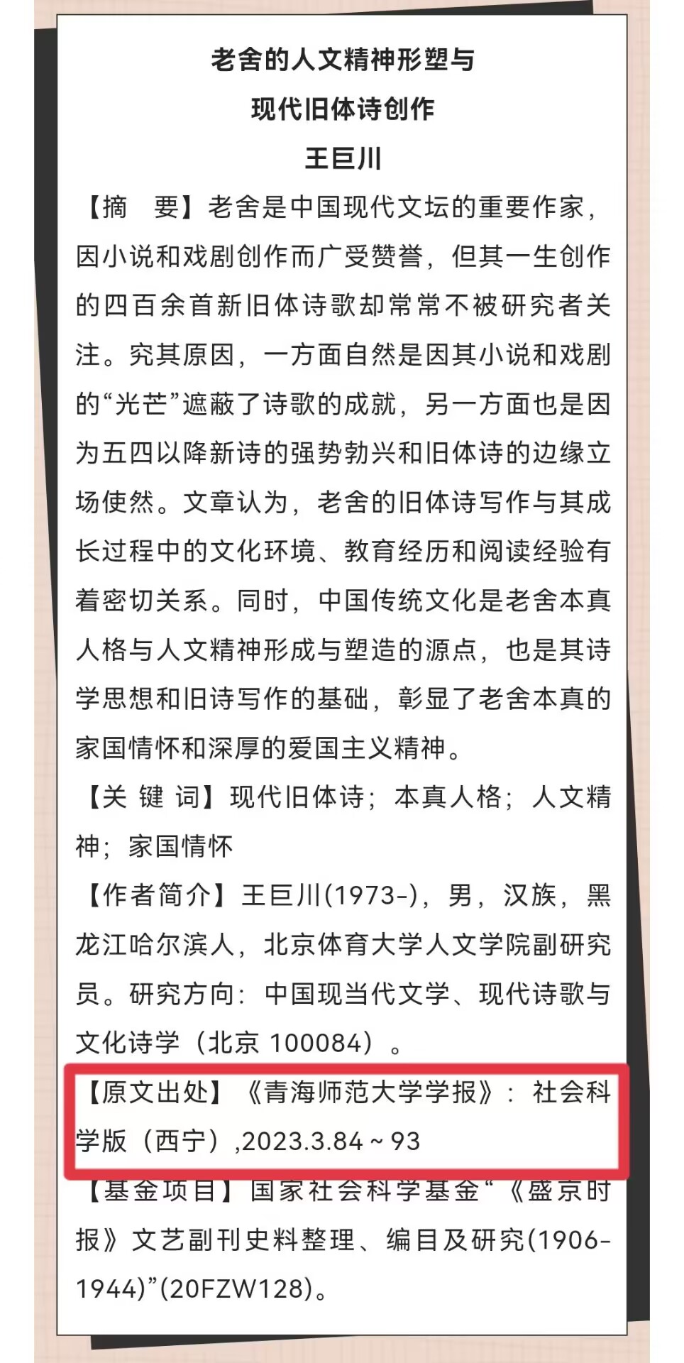 近日,《bat365在线平台登录学报》(社会科学版)2023年第3期文章《老舍的人文精神形塑与现代旧体诗创作》(作者:王巨川;责任编辑:权丽桃)被人大复印报刊资料《中国现代、当代文学研究》2024年第1期全文转载。