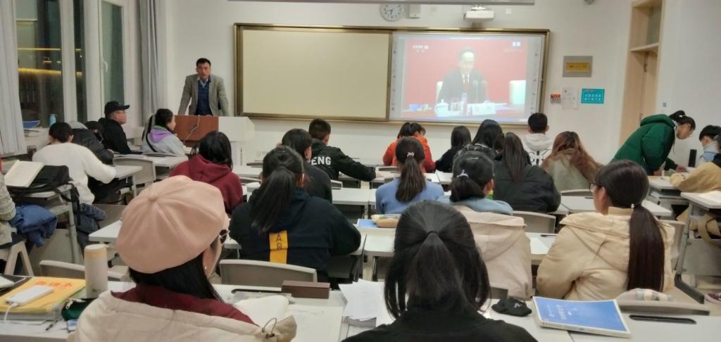 各学院通过组织学生集中观看党的十九届四中全会实况录像、学习《中国共产党第十九届中央委员会第四次全体会议公报》全文的形式带领学生深入学习习总书记重要讲话精神和十九届四中全会的重大意义。通过解读原文、研讨发言,分享体会,广大学生深刻的认识到,党的十九届四中全会是我们党站在“两个一百年”奋斗目标历史交汇点上召开的一次具有开创性、里程碑意义的重要会议。全会审议通过的《决定》,明确提出了加强和完善国家治理必须坚持的基本原则、总体要求和重大任务,是新时代坚持和完善中国特色社会主义制度、推进国家治理体系和治理能力现代化的政治宣言和行动纲领。对引导广大学生坚持学思践悟和学以致用,号召广大学生用党的十九届四中全会先进思想精神武装头脑有着重要意义。