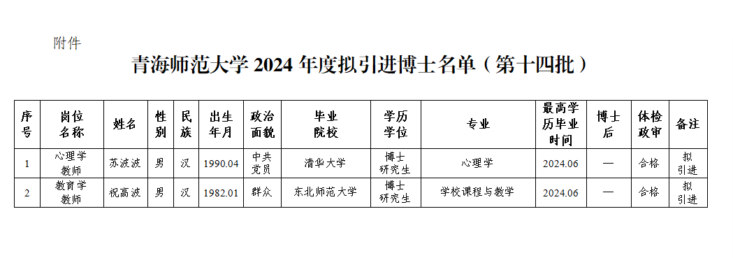 根据《青海省2024年度引进高校优秀应届毕业生公告》《青海省事业单位公开招聘工作人员办法》(青人社厅发〔2015〕80号)有关规定,365官网已完成拟引进博士苏波波、祝高波的考核、体检、考察政审等工作,现将相关信息进行公示,公示期为2024年8月6日至8月12日(共7天)。公示期间,如对拟引进人员有异议,请以来电或书面形式反映。反映情况时应署真实姓名和联系方式,匿名反映不予受理。