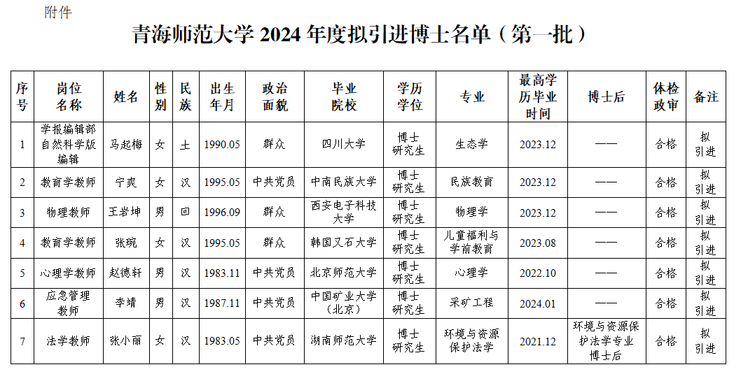 根据《青海省校园引才办法(试行)》(青组字〔2019〕334号)、《青海省2024年度引进高校优秀应届毕业生公告》和《青海省事业单位公开招聘工作人员办法》(青人社厅发〔2015〕80号)有关规定,365官网已完成马起梅、宁爽、王岩坤、张琬、赵德轩、李靖、张小丽7名拟引进博士的考核、体检、考察政审等工作,现将相关信息进行公示,公示期为2024年1月29日至2月4日(共7天)。公示期间,如对拟引进人员有异议,请以来电或书面形式反映。反映情况时应署真实姓名和联系方式,匿名反映不予受理。